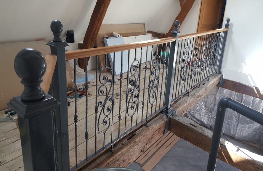 Pour un espace contemporain, on favorise des lignes nettes, des surfaces lisses, des peintures noires mates ou anthracite. Pour un lieu plus classique ou chaleureux, les rampes escalier fer forgé sont travaillées avec des volutes, des torsades, des barreaux décoratifs. Tout est possible, car tout est fait à la main.